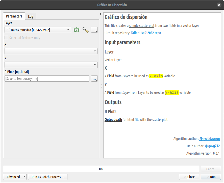 6"ALG_DESC": "<p>This file creates a <span style='text-decoration: underline;'>simple scatterplot</span> from two fields in a vector layer</p><p>Github repository: <a href='https://github.com/gavg712/taller-r-scripts-for-qgis'>Taller UseR!2022 repo</a>",